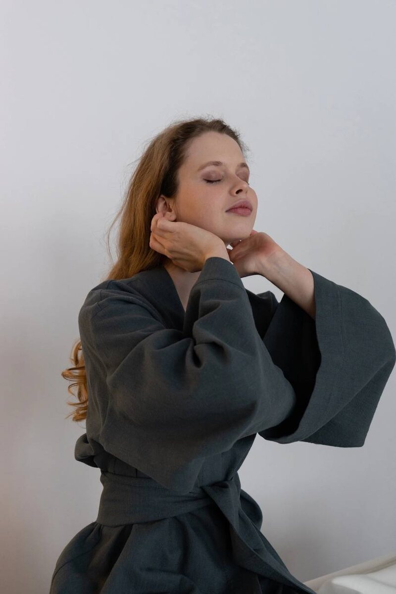 #кимоно выполнено из натурального крапивного полотна. Модель свободного кроя с широким ассиметричным рукавом. В комплекте идет отдельный широкий пояс в тон.