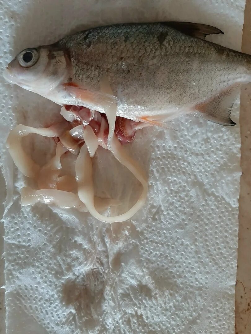 Если же вы поймали леща или плотву с раздутым брюхом, а внутри обнаружили «лапшу», такую рыбу сушить можно, предварительно удалив червя. Это лигула, и она не опасна для человека. Но если вам неприятен сам факт наличия паразита, лучше закопайте рыбу подальше от воды, чтобы не кормить птиц и не способствовать распространению заразы.