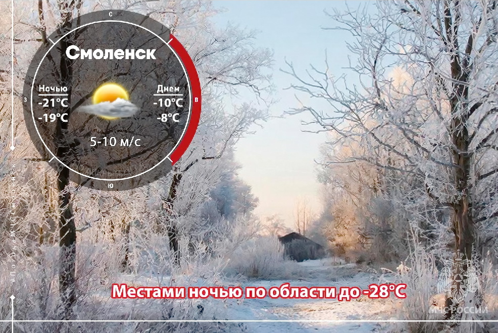❗В ближайшие 1-2 часа с сохранением до конца дня 16 февраля местами на территории Смоленской области ожидается усиление северного ветра порывы до 12-15 м/с, снег, метель❗ Завтра на территории Смоленской области прогнозируется облачная погода с прояснениями. В ночь на 17 февраля облака будут периодически сменяться просветлениями неба, при этом местами возможен небольшой снег. Днём осадки практически прекратятся, хотя отдельные участки дорог сохранят опасность гололедицы. Ночь и утро будет сопровождаться лёгким туманом. Ветер будет дуть восточной четверти со скоростью 5-10 м/с. 🔺Температура по области: ночью -22°C…-17°C, местами до -28°C, днём −12°C …-7°C; 🔺Температура в Смоленске: ночью -21°C…-19°C, днём -10°C …-8°C. Атмосферное давление: 731 мм ртутного столба, будет расти. ◼ МЧС России рекомендует жителям и гостям региона отапливать своё жилье, соблюдая правила пожарной безопасности. Выходя на улицу, будьте предельно внимательными и осторожными при передвижении, одевайтесь теплее. @