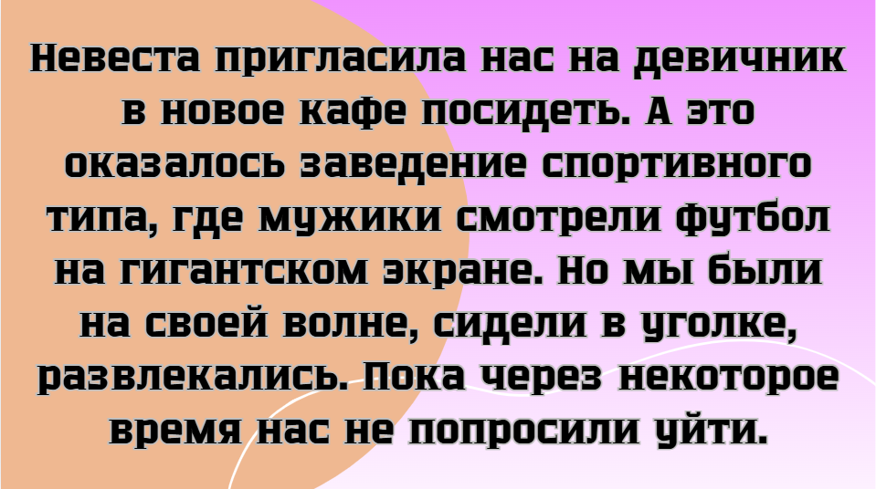 - Невеста пригласила нас на девичник в новое кафе посидеть. А это оказалось заведение спортивного типа, где мужики смотрели футбол на гигантском экране. Но мы были на своей волне, сидели в уголке, развлекались. Пока через некоторое время нас не попросили уйти, потому что дяденьки из-за нашего гогота футбольного комментатора не слышат. © Тревожное Пирожное / ADME