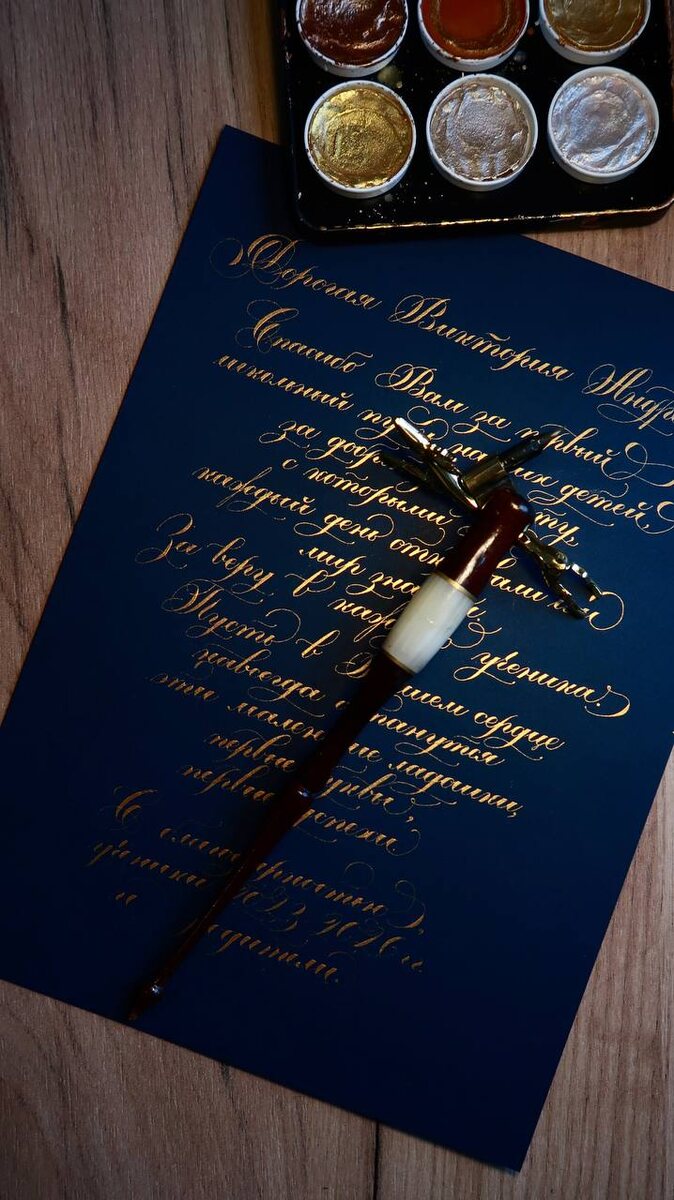 Элегантность в каждом штрихе: рукописное письмо острым пером в стиле Копперплейт, золотом на темно-синем фоне.♥️🪶