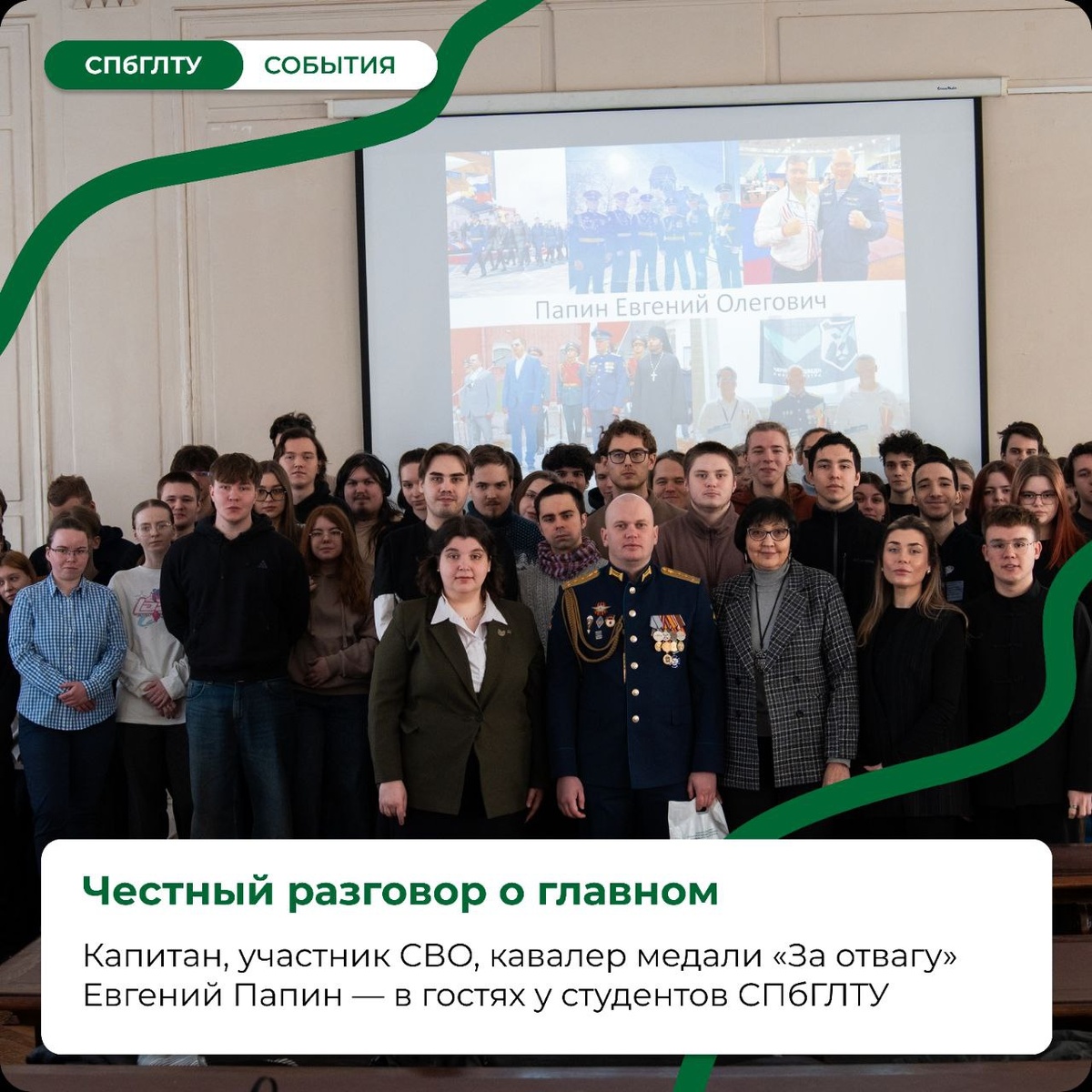 13 февраля, в преддверии Дня защитника Отечества, в нашем университете состоялась открытая беседа с особенным гостем. Папин Евгений Олегович — капитан, участник специальной военной операции, кавалер медали «За отвагу», мастер спорта международного класса по всестилевому карате, капитан спортивной команды Михайловской Военной Артиллерийской Академии — говорил со студентами о главном: чести, долге, мужском поступке и выборе. В мероприятии также приняли участие представители управления по воспитательной работе и молодежной политике СПбГЛТУ : • Шлапакова Светлана Николаевна, проректор по воспитательной работе и молодежной политике • Глушенкова Наталья Олеговна, начальник управления по воспитательной работе и молодежной политике • Могильниченко Влада Владимировна, руководитель патриотического клуба «Егерский корпус» СПбГЛТУ • Шатохин Александр Игоревич, и.о. начальника проектного офиса Встреча получилась по-настоящему живой. Евгений Олегович отвечал на вопросы, делился личным опытом и го
