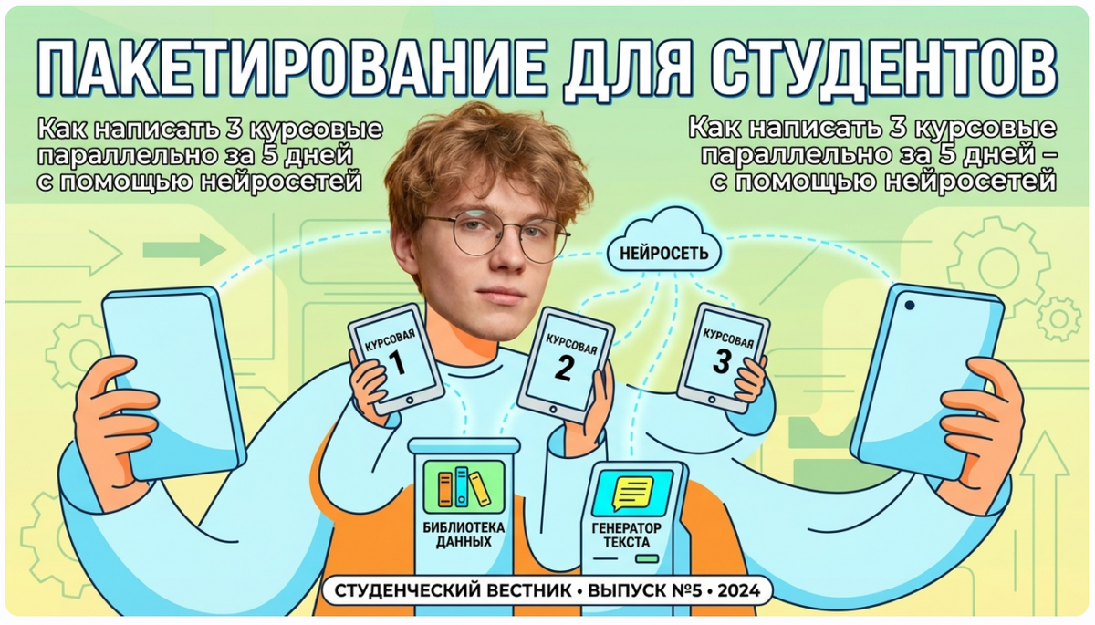 За два года я написал с помощью нейросетей 12 курсовых, 2 диплома, 15 рефератов. Сэкономил примерно 600 часов (это 25 дней) и 50000₽. На эти деньги съездил в отпуск после сессии.