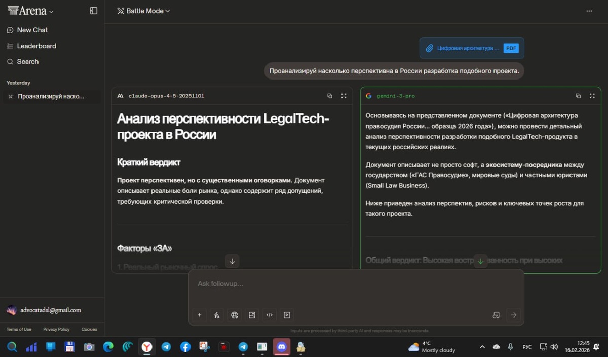 lmarena.ai теперь просто arena.ai и немного поменяла интерфейс пользователя. В общем, сделала её ближе к стандартной для бямок панели работы. В общем, откройте Алису (она без квн) или Гигачат, вот примерно то же самое. Ну, с учётом того, что российские копируют американцев [1]. В чём польза для юристов — это прямо встроенная и бесплатная [2] компаративистика: ваш запрос одновременно отдаётся в работу нескольким моделям. Потом вы выбираете наиболее удачный ответ, и уже потом вам показывается, какая модель ответила лучше. Я не вникал в суть монетизации arena.ai, мне важно понимать, какие модели лучше справляются с юридическими задачами по российскому праву и процессу. В моём личном рейтинге несколько месяцев лидирует Gemini. С учётом того, что Эрик Шмидт активно финансирует военные программы, в том числе ВСУ [3], логично ожидать, что российские силовики ликвидируют возможности использования американских моделей для отечественных правозащитников. Так что пока есть возможность обходить а
