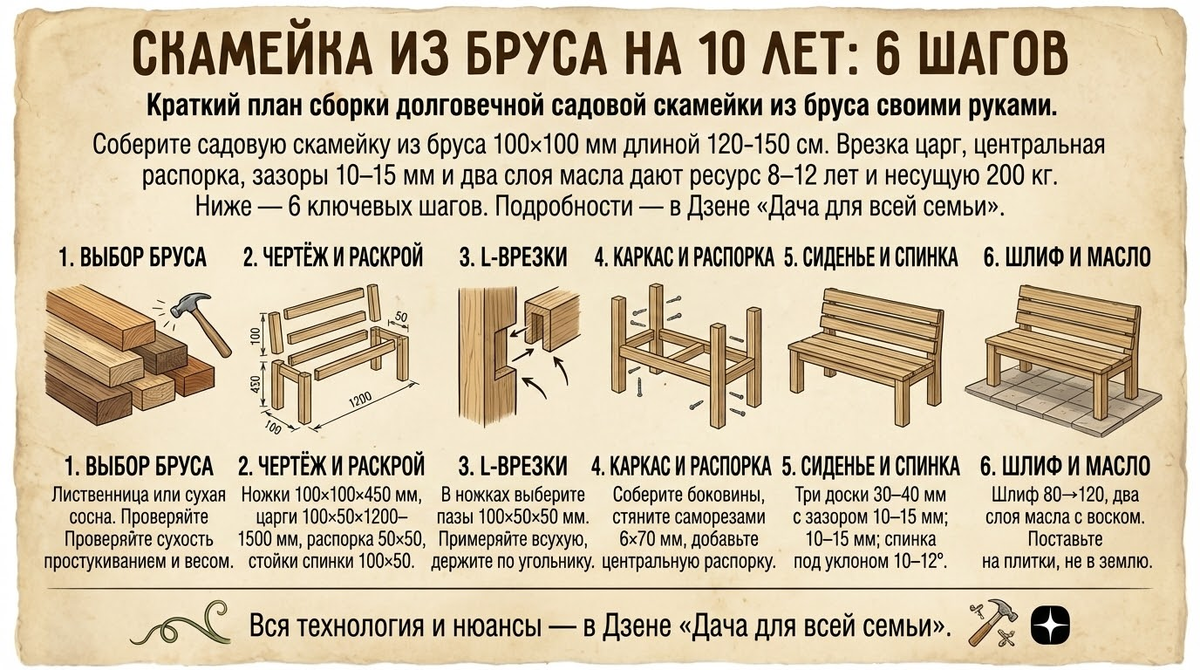 Главное в таких работах — не торопиться на базовых шагах: сухой брус, аккуратные пазы, зазоры и масло. Тогда скамейка не станет сезонной вещью, а спокойно отслужит вам свои годы.