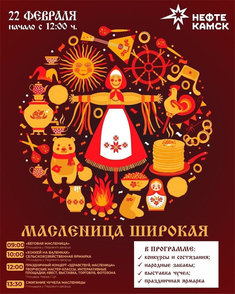 ! 📆С 16 по 22 февраля проходит масленичная неделя. В воскресенье, 22 февраля, с 12:00 начнётся праздничная программа: 📍на площади перед Городским Центром культуры состоятся: - праздничный концерт; - народные забавы; - выставка чучел. 📍 на площади у Ледового дворца пройдет сельскохозяйственная ярмарка, где соберутся фермеры, владельцы личных подсобных хозяйств, ремесленники. 🌿Давайте встретим весну вместе, наслаждаясь песнями, танцами, вкусными блинами и отличным настроением! 🥞Не забудьте принять участие в масленичных гуляниях! 👉 Подписаться на канал