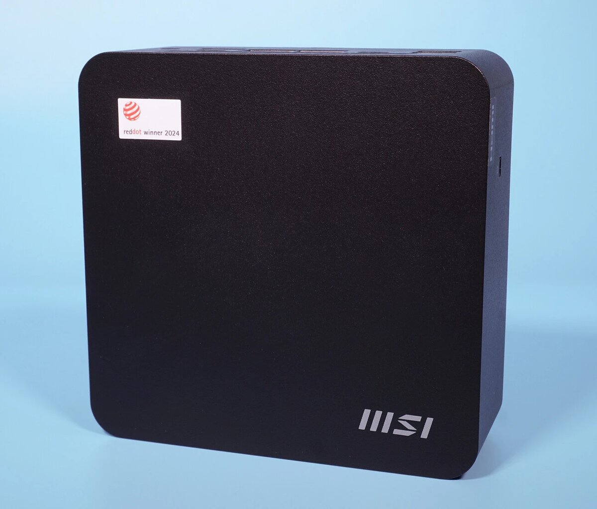 Внешне MSI Cubi NUC AI+ выглядит как типичный представитель класса мини‑ПК: строгий прямоугольный корпус без вычурных элементов. Материал — переработанный пластик (37,25 % состава), что можно расценить как шаг в сторону экологичности. Поверхность матовая, устойчива к мелким царапинам.