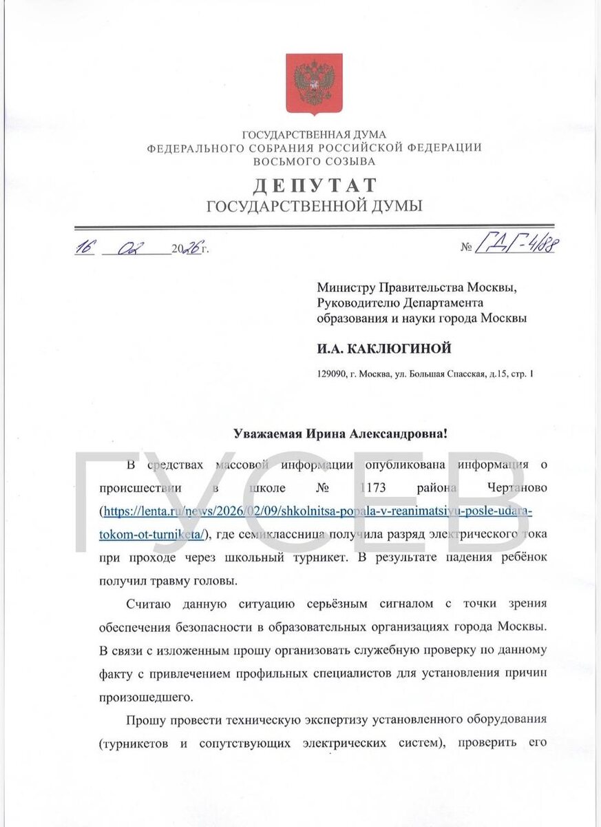 В СМИ появилась информация о серьёзном инциденте в одной из московских школ: семиклассница получила разряд электрического тока при проходе через турникет и, упав, получила травму головы. Считаю это тревожным сигналом. Речь идёт о безопасности детей в образовательных учреждениях — здесь не может быть «мелочей» или технических недоработок. Направил обращение на имя министра Правительства Москвы, руководителя Департамента образования и науки Ирины Каклюгиной с просьбой: ▪️ организовать служебную проверку по данному факту с привлечением профильных специалистов ▪️ провести техническую экспертизу турникетов и сопутствующих электрических систем ▪️ проверить соответствие оборудования действующим требованиям безопасности ▪️ дать оценку организации технического обслуживания Также считаю необходимым рассмотреть проведение внеплановой проверки аналогичного оборудования во всех столичных школах, чтобы исключить повторение подобных ситуаций. Безопасность детей должна быть обеспечена на 100%. Жд
