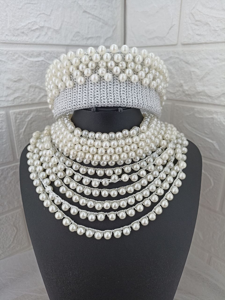 Ожерелок и кокошник с пластиковыми жемчужинами. Связан из полиамида с люрексом.