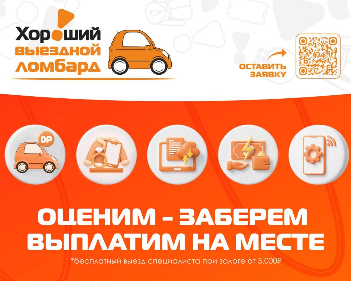 ! 🚗 ✨ ☄️Оценим - заберем - выплатим на месте. 🆓 Бесплатный выезд специалиста при залоге от 5 000 рублей. 💍💻 Оценка широкого спектра имущества: ювелирные изделия, норковые шубы, цифровая и бытовая техника, аудиотехника, строительные инструменты, спорттовары, шины и диски. ✍️ Электронный документооборот — всё быстро и прозрачно. 🌐 Дистанционное управление залогом через личный кабинет онлайн. 💳 Получение денег мгновенно на вашу банковскую карту. 💡Оставьте заявку уже сегодня и убедитесь насколько это легко и удобно.