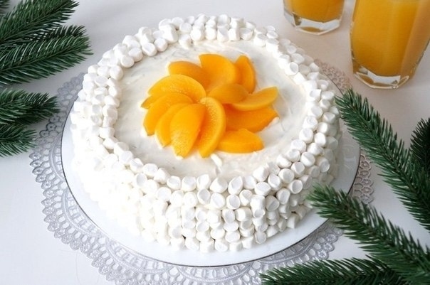 8. Украсить маршмеллоу. Также для украшения можно взять зефир. Маршмеллоу нарезать на маленькие кусочки и выложить ими бока торта. Сверху украсить дольками персиков. Охладить торт хотя бы в течение 1 часа, затем подавать на стол порционно к чаю и т.д.