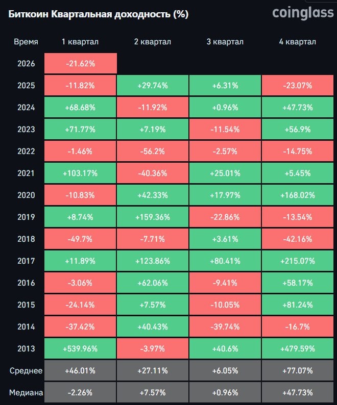📉 $BTC упал на 22% с начала 2026 года, что стало САМЫМ ПЛОХИМ показателем за ПЕРВЫЙ КВАРТАЛ с 2018 года