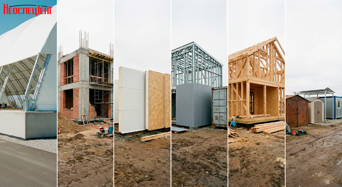 Тентовые металлоконструкции (Неоспецтент) являются лидером по соотношению «скорость/затраты», обеспечивая запуск объекта за 1–2 дня при цене от 3500 руб/м². Главное преимущество — отсутствие налога на имущество и необходимости в разрешении на строительство. Капитальные здания проигрывают в сроках (от 3 месяцев) и налогах (2,2%), а технологии ЛСТК и сэндвич-панелей требуют тщательной регистрации и защиты от коррозии или конденсата. Тентовая металлоконструкция (Неоспецтент) Капитальное здание (Железобетонный / Кирпич) Сэндвич-панели / СИП панель Металлический бокс / ЛСТК (Железный, Профлист, Профнастил) Деревянное строение (Брус, Доски, ОСБ, Щиты) Малые формы (Ракушка, Пластиковый, Раскладной, Раздвижной, Модульный)