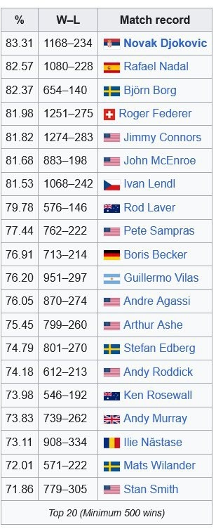 ? Вот список лучших теннисистов по этому показателю: Новак Джокович 83.31% (1168-234) Рафаэль Надаль 82.57% (1080-228) Бьорн Борг 82.37% (654-140) Роджер Федерер 81.98% (1251-275) Джимми Коннорс 81.82% (1274-283) Подпишись на Эйс и точка