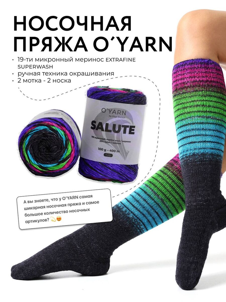? 💫😍 ✔️ Всего в коллекции O’YARN 6 носочных артикулов, и каждый — просто восторг. На этой неделе мы расскажем про каждый! А начнем с SALUTE. Выпуская свою носочную пряжу мы сделали то, что никто не делал НИКОГДА! Наша носочная пряжа УНИКАЛЬНА ❤️ - Вся носочная пряжа O’YARN производится на нашей собственной основе: 19-микронный меринос EXTRAFINE SUPERWASH - Пряжа окрашивается техникой ручного окрашивания, одна половина носка окрашена в однотонный цвет, а вторая в градиент или четкие полосы. - Моток разделен на два по 50 г, чтобы у вас получалось два одинаковых носка. Все просто: 2 мотка - 2 носка! НОСОЧНАЯ ПРЯЖА SALUTE от O’YARN окрашивается уникальным методом, который недоступен в производственных масштабах: половина носка окрашена в однотонный цвет, а вторая — чёткими полосами. Полосы могут быть разного цвета, в палитре 10 уникальных оттенков. Вы можете начать вязать с цветной части носка, а затем перейти на носочную часть где захотите: повыше или пониже. Вы можете сами рег