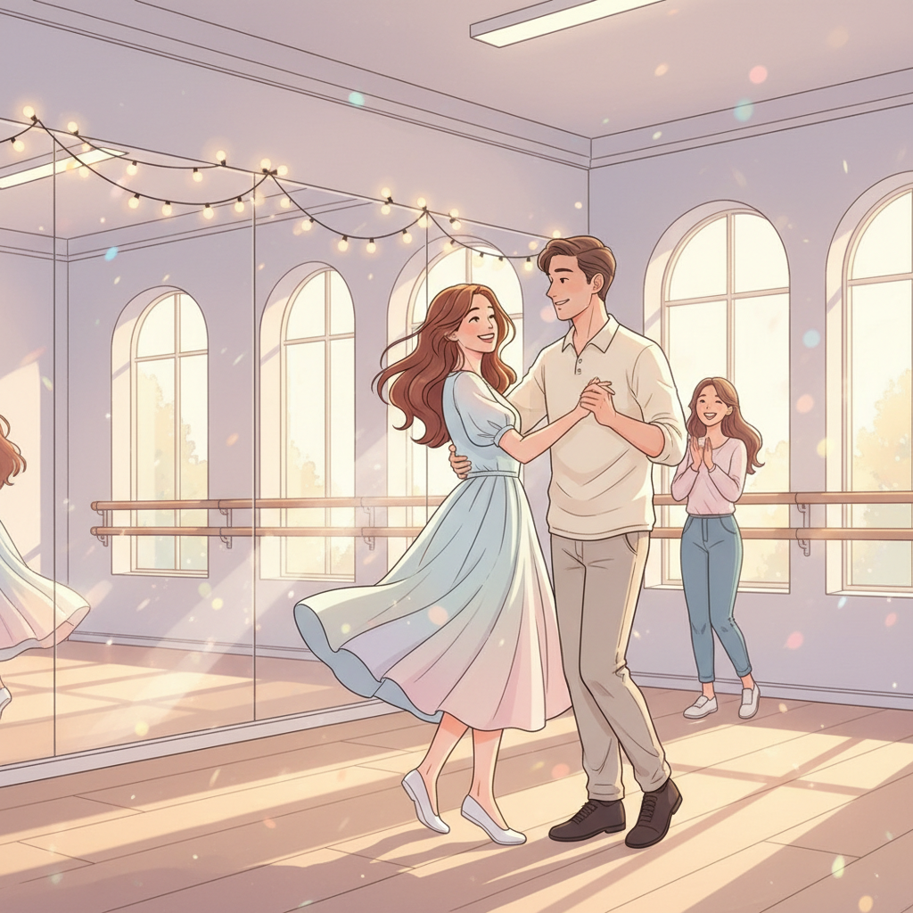 — Так. Сегодня — основы: рамка, шаг, ведение. Девочки, не бойтесь довериться партнёрам. Мальчики, не бойтесь быть уверенными.