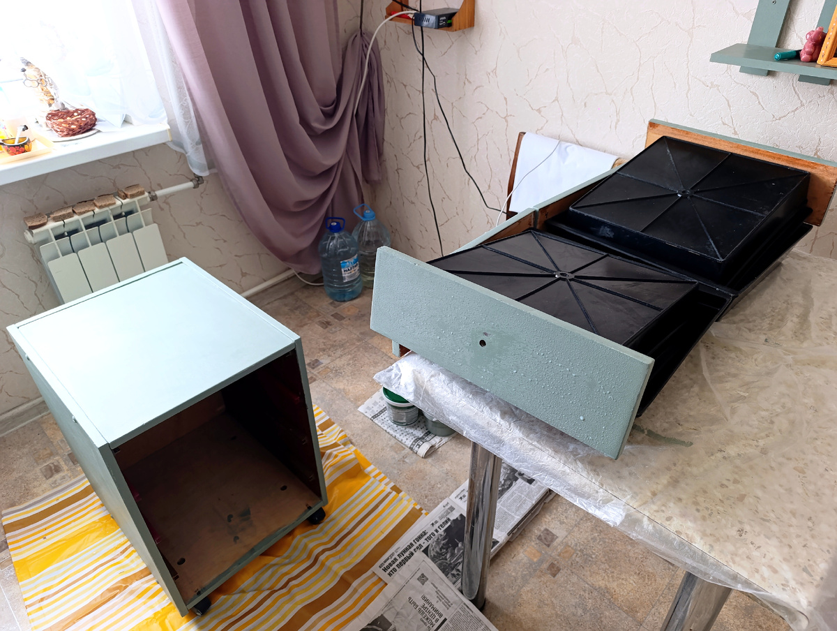После покраски кухонного гарнитура, осталось покрасить тумбочку, которая к нему отношения не имеет. Когда-то она была обычной полированной тумбочкой, но во время первой реставрации, решили и её покрасить. Получилось.