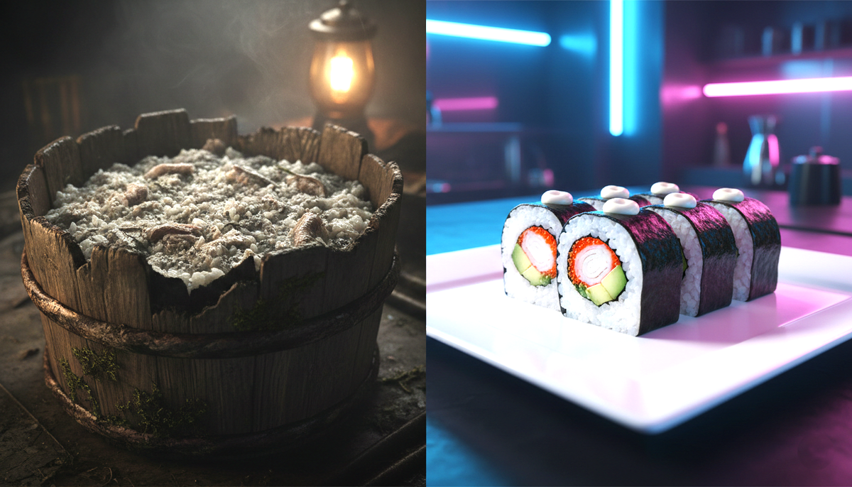 Суши. Изначально это способ консервации рыбы в протухшем рисе, который выбрасывали. Как это было на вкус до превращения в современное блюдо?