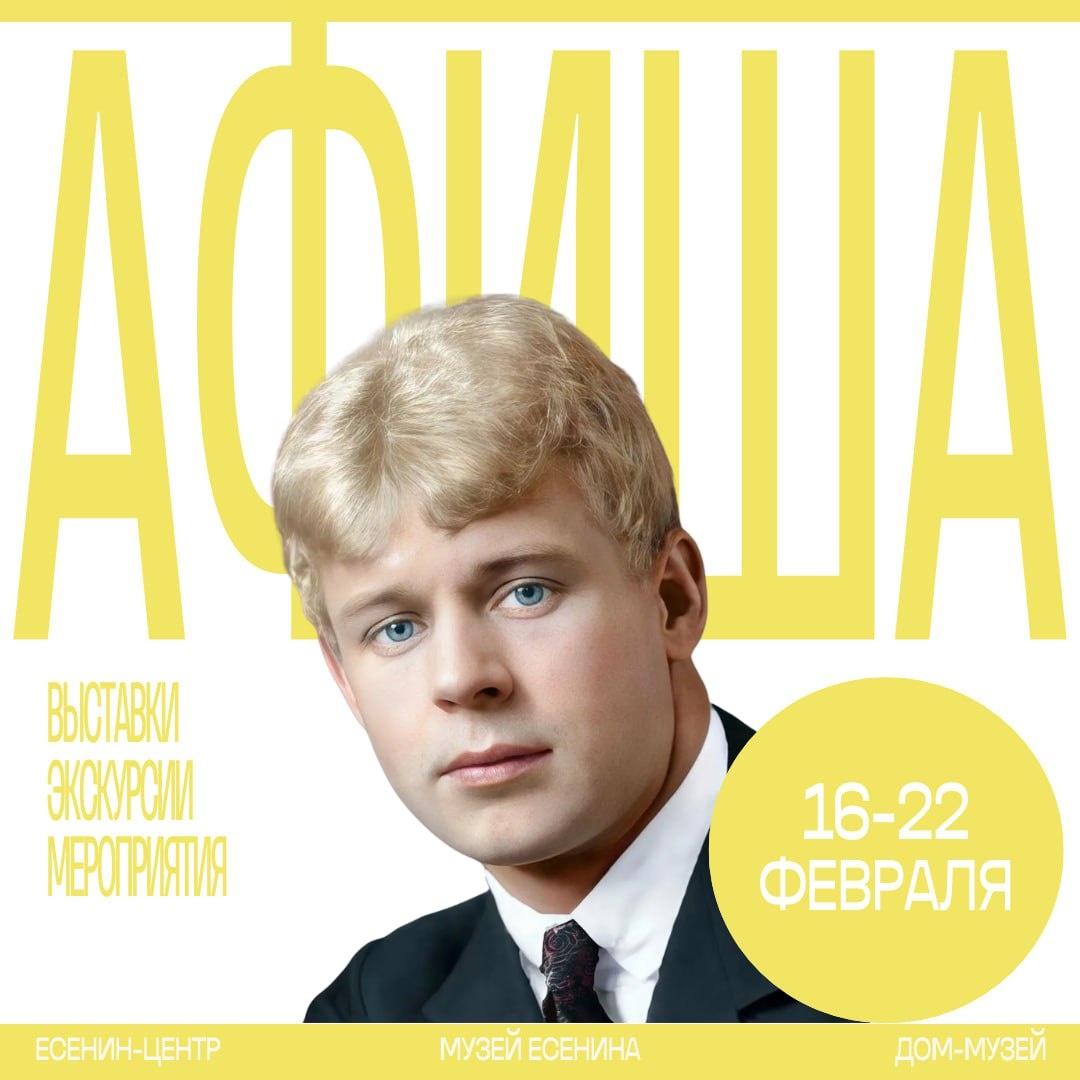 🍂🍂🍂🍂🍂 События в музее Есенина на неделю Выставки: Есенин-центр (переулок Чернышевского, 4, стр. 2): ⚫️17-22 февраля. Выставка "Поезд № 143". ⚫️17-22 февраля. Выставка "Фронтовик Константин Есенин". ⚫️20 февраля с 10:00 открывается новая выставка "Черный человек. Исповедь поэта". Дом-музей С.А. Есенина (Большой Строченовский переулок, 24, стр. 2): 17-22 февраля. Постоянная литературно-мемориальная экспозиция. Мероприятия: Есенин-центр (переулок Чернышевского, 4, стр. 2): ⚫️18 февраля в 19:30. Спектакль "Проведите меня к нему..." ⚫️19 февраля в 19:30. Спектакль "Бродский. Зима". Экскурсии: Есенин-центр (переулок Чернышевского, 4, стр. 2): ⚫️21 февраля 17:00-18:00. "Я один… И разбитое зеркало". Специальная экскурсионная программа к выставке «Черный человек. Исповедь поэта». Экскурсию допллняет мастер-класс по созданию коллажа «Черный человек в мире супрематизма». Билеты приобретаются отдельно в кассе Музея. @esenin_mosmuseum