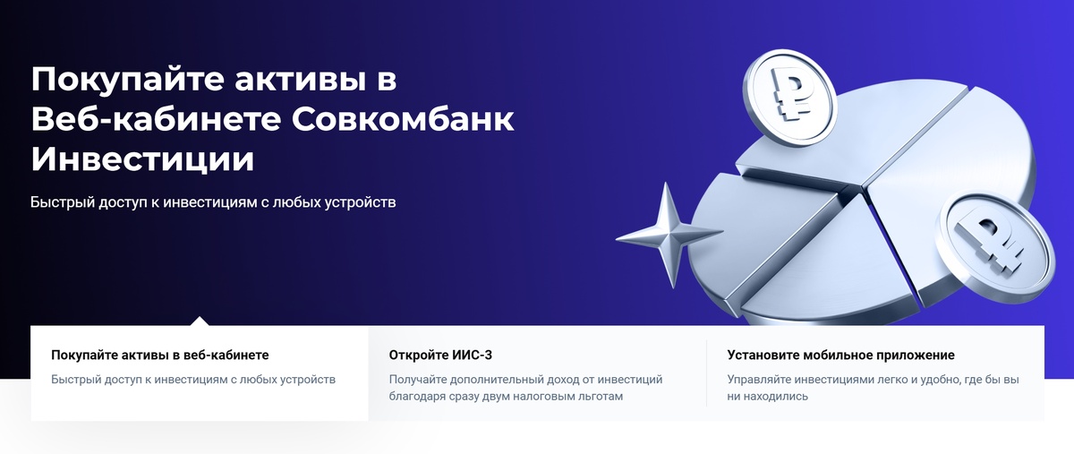 «Совкомбанк Инвестиции» — это инвестиционная платформа, предлагающая физическим лицам доступ к инвестициям на финансовых рынках через брокерский счёт или индивидуальный инвестиционный счёт (ИИС). Сервис позволяет клиентам покупать и продавать финансовые активы, управлять портфелем и обучаться инвестиционной практике в удобном цифровом формате.