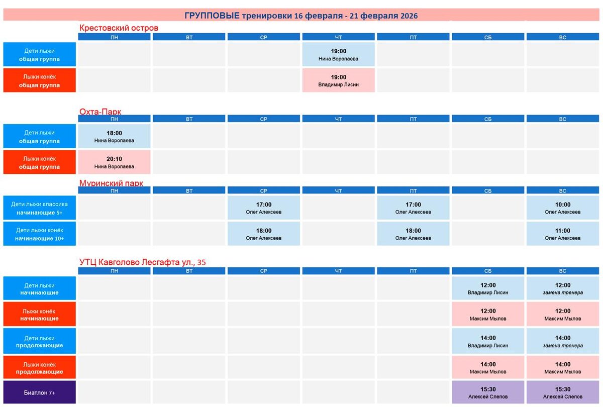 ❗️Добавляем детские тренировки в Муринском парке с уже взрослым учеником Максима Огаркова Олегом Алексеевым Обратите внимание на две группы - младшие на классике, старшие на коньке 😆 ❗️Успевайте позаниматься с Максимом Мыловым на УТЦ - 23 февраля он уедет на сборы и минимум до середины марта его не будет ❗️В эти выходные тренировок на Крестовском острове не будет, так как и в субботу, и в воскресенье с 9:00 до 17:00/17:30 трасса будет закрыта в связи с проведением соревнований