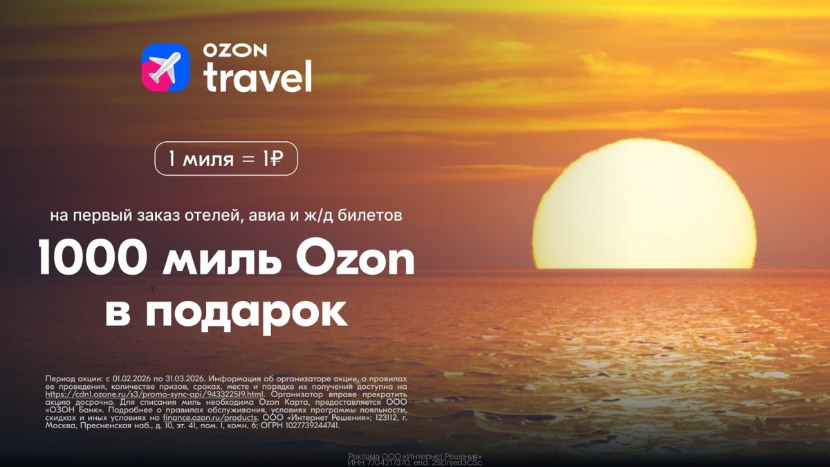 1) Переходи по ссылке (https://gtblg.ru/tN4U8?erid=2SDnjed3CSc) 2) Вводи промокод EZMQGE8A И получи 1000 миль на первое бронирование отеля или билетов! (1 миля = 1₽) А еще получай кешбэк милями, выполняй задания квеста и оплачивай ими до 99% от стоимости заказа! *Cкидка по промокоду суммируется с акциями, но не суммируется с другими промокодами. Списать мили можно только с Ozon Картой. Акция для новых пользователей Ozon Travel