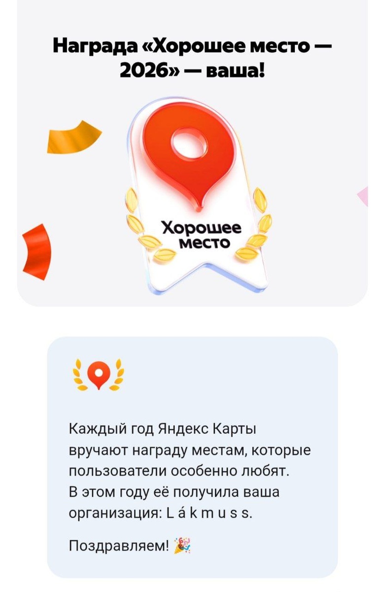 Ваш любимый Лак, где волосы обретают счастье, который год подряд на доске почёта. За что, конечно же, огромное спасибо всем, кто пишет отзывы! А если по каким-то причинам вы всё ещё стеснялись выразить свой восторг, вот он знак вселенной 🙂 L á k m u s s Награда «Хорошее Место» наша! https://yandex.ru/maps/org/173493890662