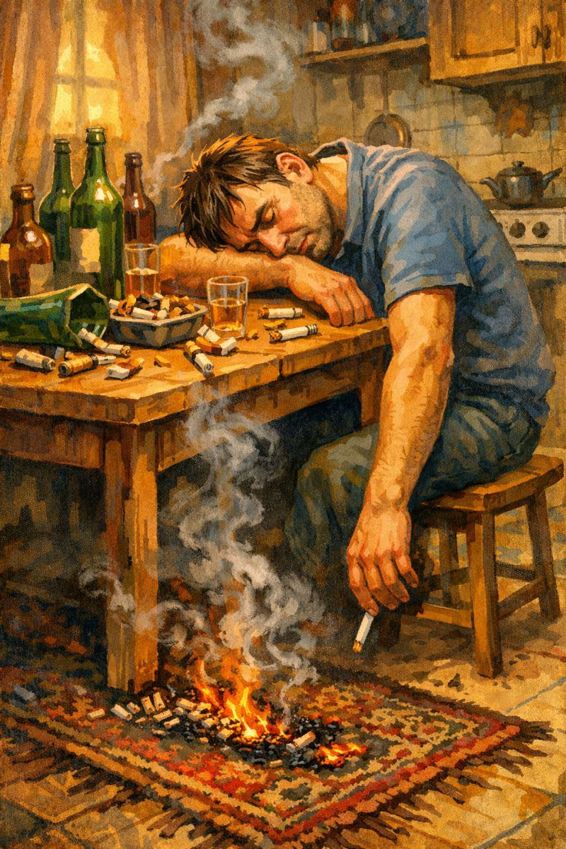 Через полчаса его начало клонить в сон. Голова упала на руки, сложенные на столе. Сигарета выпала из пальцев на край стола, покатилась... и упала прямо на старый половик возле печки.
