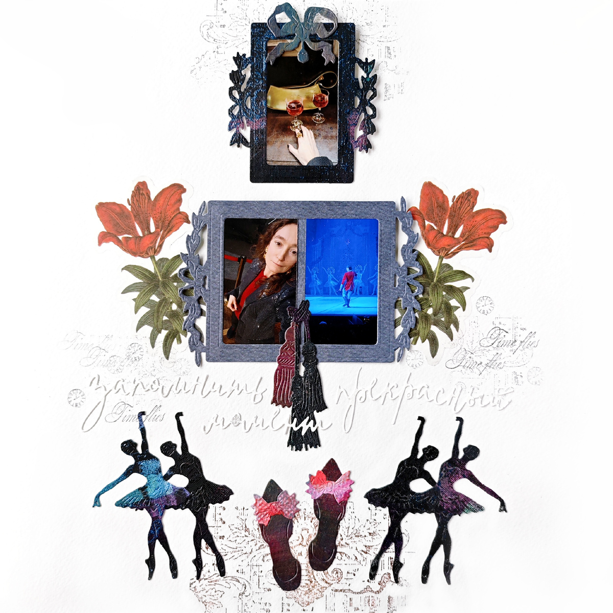 Привет - привет! С вами Надя )) Сегодня у меня страница про поход на "Щелкунчика", но самого героя разместить в итоге не удалось )) Звезда моего балета - набор "Щелкунчик"! Рамки получила путем двойного проката, большую рубила аж четыре раза )) Все не могла выбрать бумагу и размеры. Балерин из "Русские сезоны" сделала симметричными, украсила эмбоссингом. Украсила все бантами и кистями из "Театральная гостиная" и "Пышная эпоха", добавила туфли "Для всей семьи". "Важные слова" помогли с заголовком ))