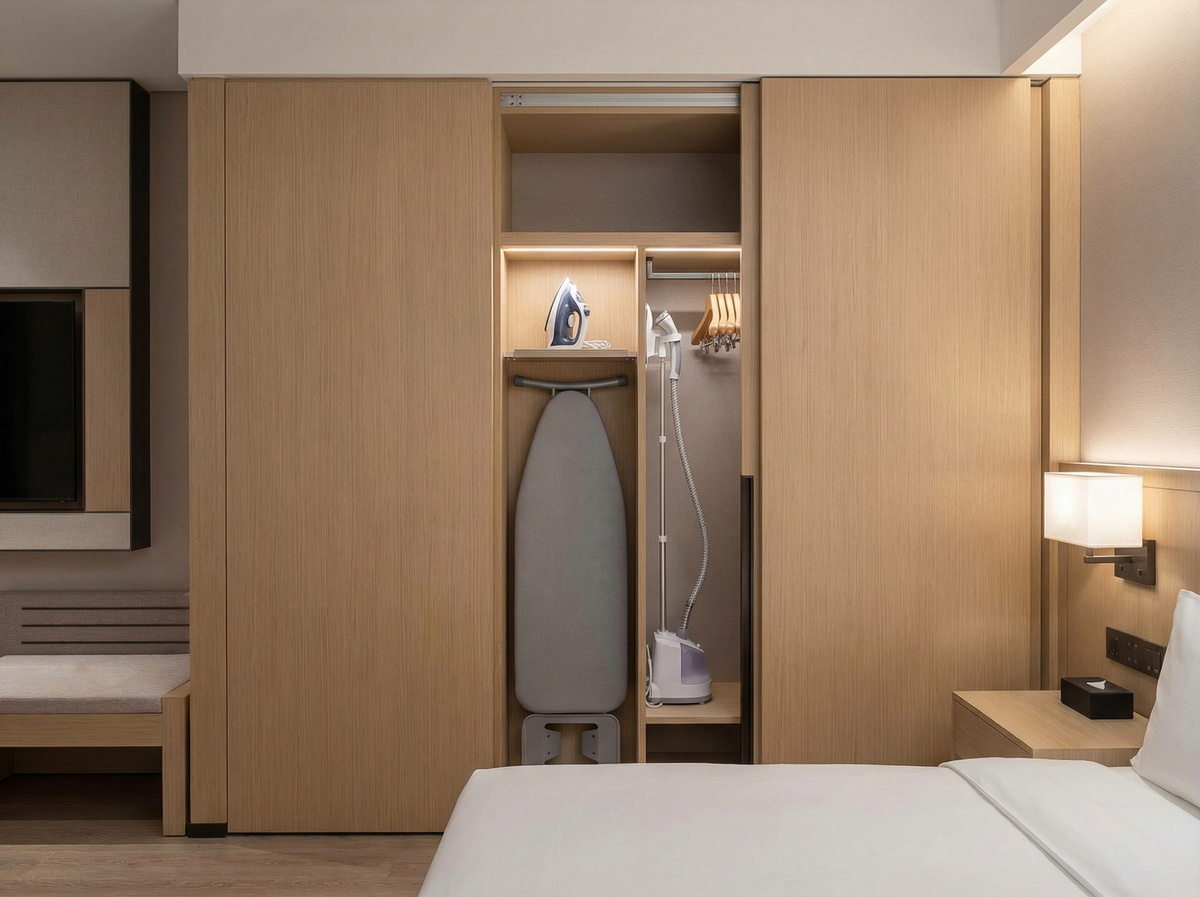 Пятое — скрытое хранение гладильной доски и утюга. В отелях их прячут в шкафах или специальных нишах — так, чтобы они всегда были под рукой, но не занимали место и не портили вид комнаты.
