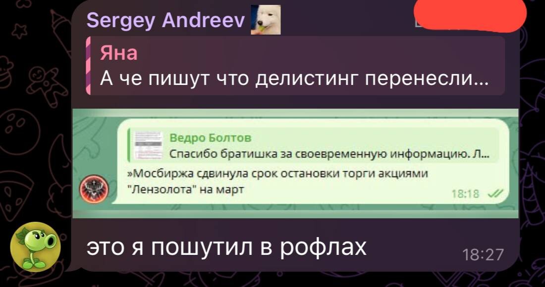 Московская биржа перенесла срок остановки торгов обыкновенными и привилегированными акциями ПАО «Лензолото» с Февраля на март. Согласно сообщению биржи, изменения связаны с переносом сроков ликвидации эмитента. С 17 февраля по 27 марта допустимыми являются коды расчетов, предусматривающие исполнение сделок не позднее 27 марта (последний торговый день в стакане Т+1 - 26 марта). Про стоимость акций после делистинга, много умных чисел: я понял, откуда он СЧА взял это по РСБУ за первый квартал прошлого года минус дивы по префам в мае 3.3 ляма итого, на балансе могло оставаться ~330млн но деньги под проценты на счетах тусят а общих акций 1 487 300 (этот Роман хотел нас ввести в заблуждение красивыми цифрами, но не вышло) если они держали деньги 9 месяцев под 15%, это было бы 367 лямов минус зп, юристы, налог на прибыль, туда сюда я думаю в 350 лямов уложатся итого 235-240р на акцию (с) Сергей Априори @sosisochnayagazeta