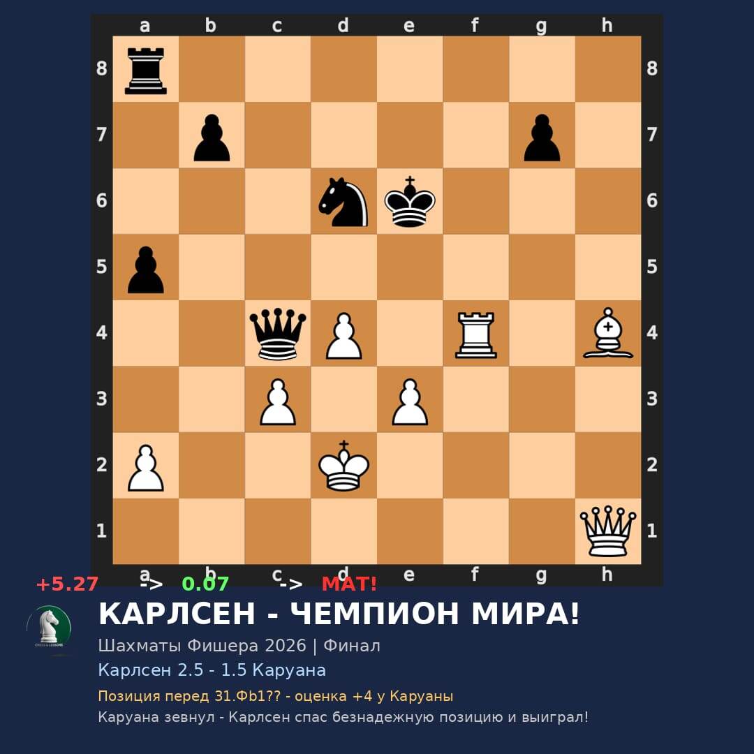 ! Магнус Карлсен одержал победу в финале над Фабиано Каруаной со счетом 2.5-1.5 в Вайсенхаусе, Германия. Это 21-й титул чемпиона мира для норвежца! Решающей стала третья партия - один из величайших камбэков в истории. Карлсен грубо ошибся на 15-м ходу (15...Сxh4??), отдав позицию с оценкой +5.27 в пользу Каруаны. Казалось, все кончено. Но в жестком цейтноте Каруана не выдержал давления. Сначала 31.Фb1?? (оценка рухнула с +4 до 0), а затем 35.Фb3?? и 36.Фd5?? - три зевка подряд превратили выигранную позицию в мат в 9 ходов! Карлсен поставил мат ходом 37...Лf1#. Из безнадежных -5 к победе за 7 ходов. Разбор на Lichess: https://lichess.org/study/K3IGgk2c/HTIU2qF3