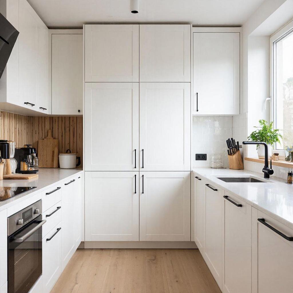 Отдельного внимания заслуживает фурнитура. Ручки — это не мелочь, а полноценный элемент дизайна. Скрытые профили создают ощущение цельности и минимализма, кожаные добавляют уюта и тактильности, а латунные или чёрные акценты подчёркивают стиль и делают белый цвет более выразительным. Именно за счёт фактур кухня с белыми фасадами приобретает характер и перестаёт быть безликой.