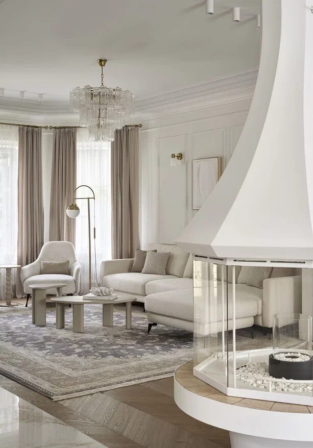 проект «Дом светлых встреч» Этот дом — это настоящее родовое гнездо, место, где собираются три поколения семьи, где каждый уголок продуман до мелочей и наполнен смыслом. Интерьер дома мы создали в мягкой, светлой гамме, чтобы он обволакивал, успокаивал и вдохновлял своих жителей. Первый этаж — это сердце дома, где встречаются традиции и современность: уютная гостиная с камином и винтажными деталями,