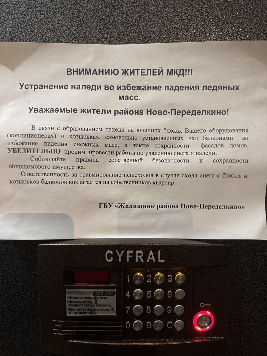 появления. Сегодня нам прислали такое объявление и задали вопрос: а действительно ли собственники квартир понесут ответственность за падение снега с их балкона или кондиционера? Наш пост об этом. Суровые российские законы устанавливают ответственность виновных за причинение вреда чужому имуществу или здоровью. Наши справедливые суды, к сожалению, не всегда имеют единое мнение по вопросу о том, кто же виновен в таком причинении вреда в случае падения снега (льда) на человека или автомобиль. Если снег упал с крыши многоквартирного дома, то, очевидно, виновна в этом управляющая организация. А если с козырька балкона или поверхности личного кондиционера? В таких случаях пострадавшие нередко сталкиваются с трудностями обращения с претензией, а юристы – с доказыванием в суде. Практика в судах, как мы уже упомянули, неоднозначная, однако, обращаем внимание вот на что. Если вы самовольно установили над балконом козырёк (то есть такая конструкция не была изначально предусмотрена проектом дома)