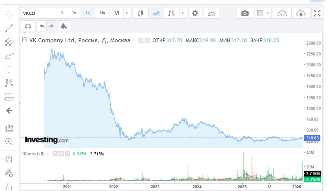 Что же касается российских продуктов, то они во многом уступают аналогам, хотя нужно отдать должное, их развитием занимаются хорошие специалисты из сферы российского ИТ (на уровне высшего среднего менеджмента и ниже). Однако superapp из ВК и ОК не выходит, несмотря на все попытки. И проблема здесь не столько в функциональных или интерфейсных невозможностях, сколько в управленческих решениях. Все мы, к примеру, помним жалобы блогеров на партнерскую программу и тамошнюю систему рекомендаций. Это не может не отражаться и на акциях компании. Для понимания приведен график VK в динамике по годам (цена для для VK - в рублях).