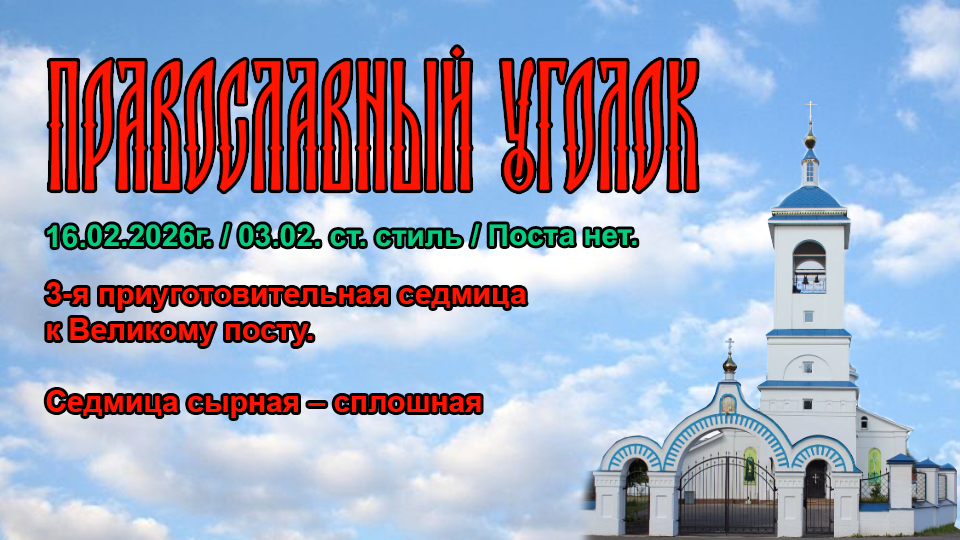3-я приуготовительная седмица к Великому посту. Седмица cырная – сплошная. Попразднство Сретения Господа Бога и Спаса нашего Иисуса Христа. День памяти Праведного Симео́на Богоприимеца. День памяти Праведной Анны Пророчици, дочери Фану́иловой. День памяти Благоверного князя Романа Угличского. День памяти Равноапостольного Николая (Касаткина), архиепископа Японского. День памяти Святителя Симео́на Полоцкого, епископа Тверского. День памяти Святителя Игна́тия, митрополита Мариупольского. День памяти Пророка Аза́рии. День памяти Мучеников Папия, Диодора и Клавдиана Пергийских (Памфилийских). День памяти Мучеников Адриана и Еввула Ванейских, Кесарийских (Палестинских). День памяти Мученика Вла́сия (Вуко́ла) Кесарийского (Каппадокийского). День памяти Сщмчч. Иоа́нна Томилова, Тимофе́я Изотова, Адриа́на Троицкого, Васи́лия Залесского, пресвитеров, прмч. Влади́мира (Загребы), иеромонаха и мч. Михаила Агаева (1938).