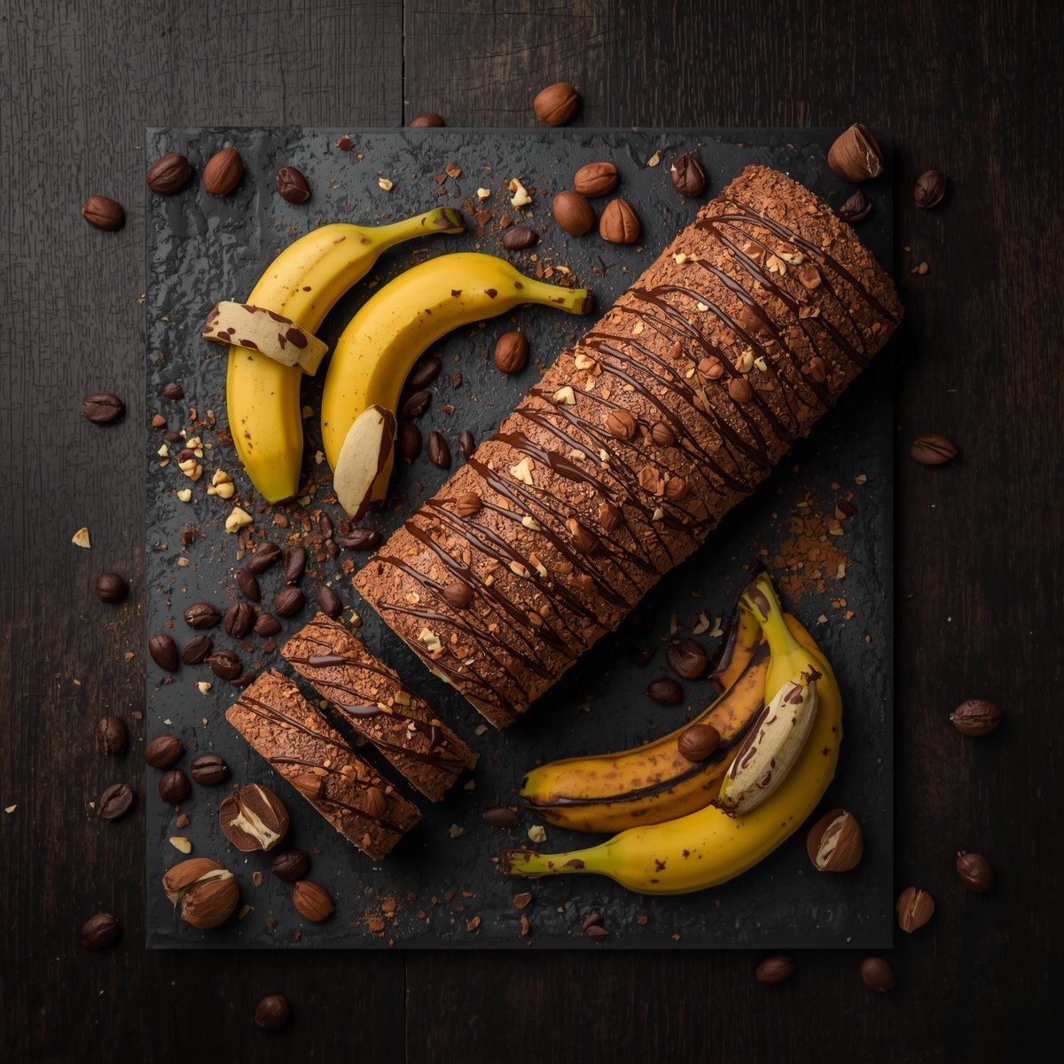 Этот рулет — идеальный баланс текстур и вкусов. Мягкий шоколадный бисквит, кремовая шоколадная начинка, сочный банан и хрустящие орехи. Каждый кусочек — маленькое приключение.