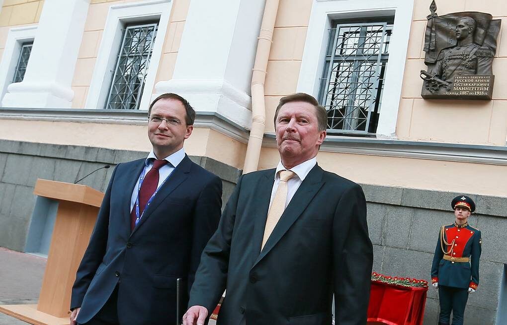 //СМИ:"16 июня 2016 года, в день рождения финского маршала Карла Густава Маннергейма в Санкт-Петербурге была торжественно открыта мемориальная доска в его честь. При открытии присутствовали официальные лица: глава Администрации президента Сергей Иванов, министр культуры Мединский".//