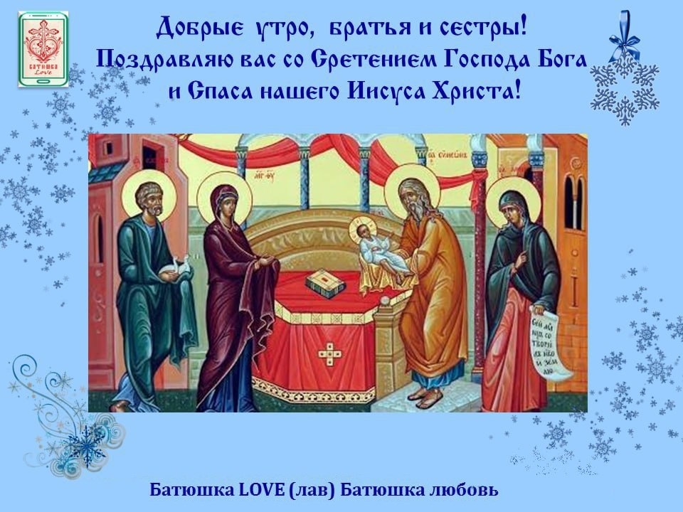 Господом, чтобы мы стояли в твёрдости веры и святости жизни. Слова "ныне отпускаеши..." относятся не только к ветхозаветной церкви, они относятся к каждому из нас. Рано, или поздно они коснутся нас своей сущностью, поэтому важно всегда помнить о них, а вместе с тем и о том, что мы всегда стоим пред Богом, хотя не всегда сознаём это или заглушаем это сознание суетой, грехами и непокорностью воле Божией. Пусть нынешний праздник пришествия Христа в храм и встреча Его в этом храме подвигнут нас к размышлению о Боге и о самих себе, о нашем неизбежном "ныне отпускаеши..." и да будет для нас тогда мирной и радостной встреча с Христом Богом нашим, к которому всегда должна стремиться христианская душа.
