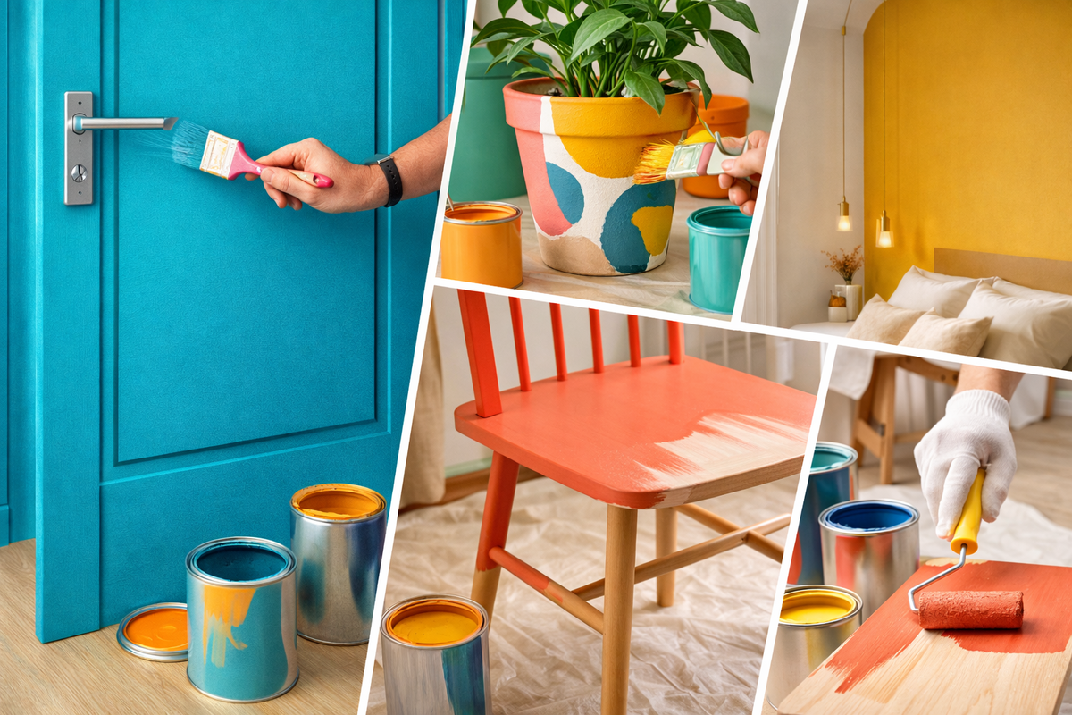 После ремонта у всех одна и та же история: в кладовке стоят банки с краской, выбросить жалко, а что с ними делать — непонятно. На самом деле это отличный повод освежить квартиру без новых трат. Вот несколько идей, как пустить остатки в дело. Покрасить двери Дверь обычно воспринимается как что-то фоновое и незаметное. А если покрасить её в яркий цвет — она превратится в акцент, который задаёт настроение всей квартире. Подойдут остатки алкидной эмали или акрила для дерева — эти краски прочные, не боятся рук и влажной уборки. Можно покрасить дверь целиком, выделить только торцы или нарисовать геометрический узор, если красок несколько. Выделить акцентную зону Акцентная стена — проверенный способ зонировать комнату. Если краски много, можно выделить всю стену за изголовьем кровати или рабочим столом. Если совсем чуть-чуть — нарисуйте крупный круг, арку или прямоугольник. Даже такая простая графика меняет восприятие пространства: комната сразу выглядит структурнее и интереснее. Обновить ваз