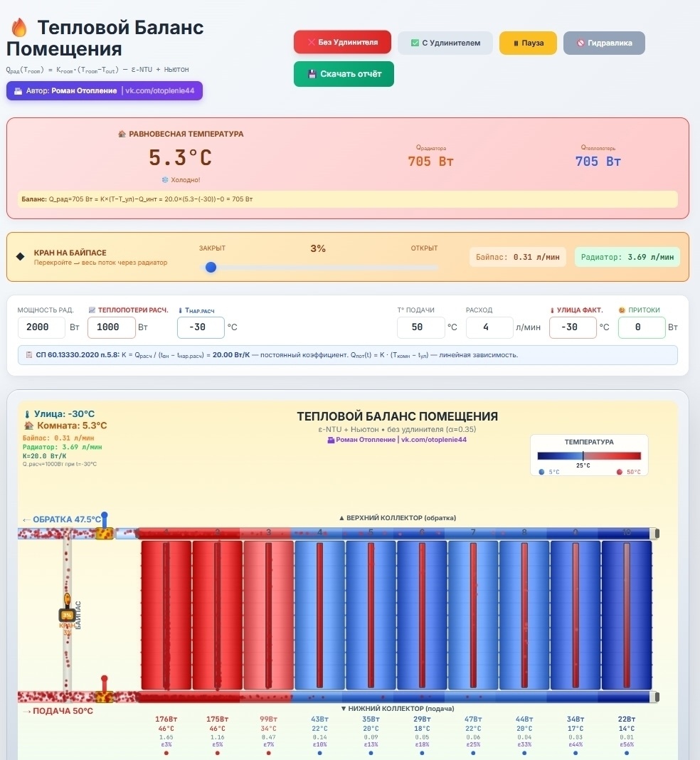 ✏️ Водоснабжение и канализация: Всех приветствую) многие из вас сталкивались с ситуацией, когда биметаллический радиатор, при подаче с низу прогревается неравномерно теплоотдача падает.. Причина — гидравлика. Сейчас разрабатываю инженерный калькулятор с визуализацией, который покажет: - траектории движения теплоносителя внутри радиатора с удлинителем потока и без); - распределение температуры по секциям; - реальную теплоотдачу в % от паспортной; - скорости и перепады давления; Калькулятор будет учитывать количество секций, расход через радиатор, тип подключения и наличие/отсутствие удлинителя потока.считать гидравлику и т.д Вопросы к вам: 1. Какие конкретные случаи вас интересуют больше всего 2. Какие ещё параметры стоит включить 3. Интересно ли посмотреть как меняются параметры байпас с краном или без.. пока это для центрального отопления) Пишите в комментариях — на основе ваших пожеланий определю приоритетные функции и очередность реализации. Водоснабжение и канализация Групп