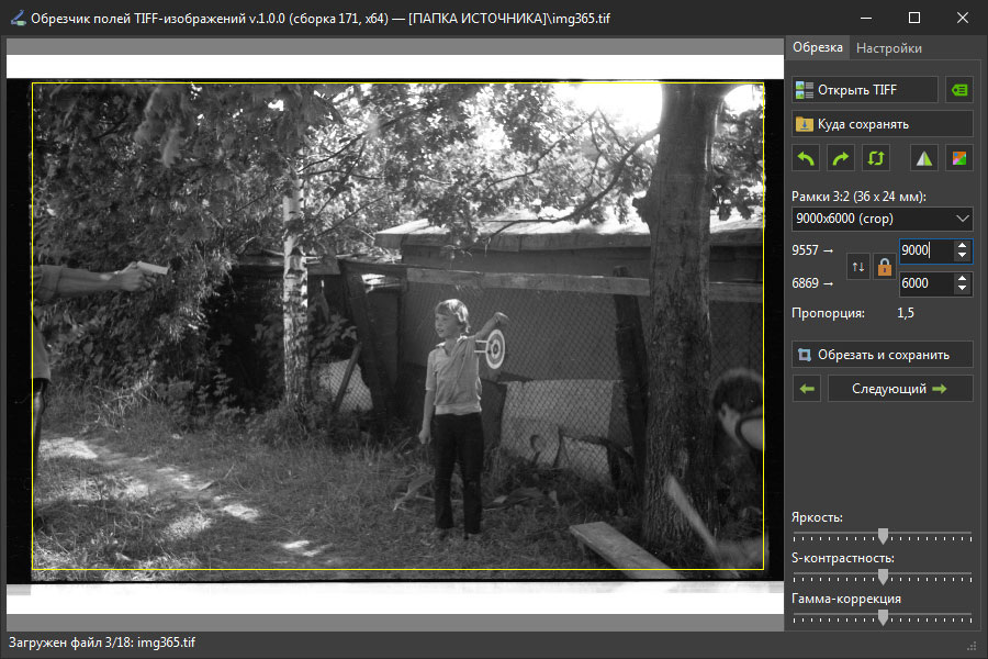 Файлы загружаются в TIFF Trimmer либо через кнопку «Открыть TIFF», либо групповым перетаскиванием из проводника в окно программы. В программе автоматически открывается первый файл из выбранного списка. Нажатием кнопки «Куда сохранять» выбирается чистовая папка для сохранения обрезанных файлов. Не забывайте её менять перед обработкой каждой следующей плёнки, потому что файлы с одинаковыми именами программой перезаписываются. Не сбрасывайте нумерацию файлов при сканировании каждой следующей плёнки, чтобы не было файлов с одинаковыми номерами — это подстрахует вас от ошибок.