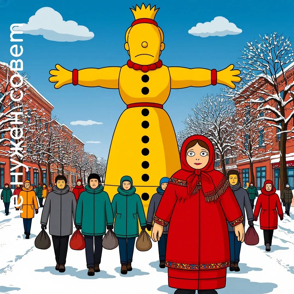 Предание о Масленице понравились сыну. С помощью ИИ он сделал иллюстрации, видимо, про то, как люди несут к Масленице свой хлам))):