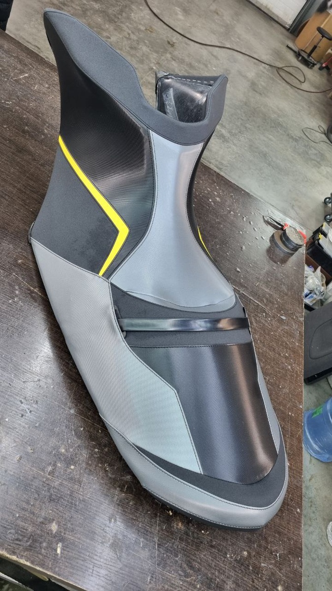 Перетяжка сиденья на гидроцикл. Использованы материалы для водной техники. Заводской крой. По желанию клиента добавили пару элементов серого цвета. И не стали делать надписи.