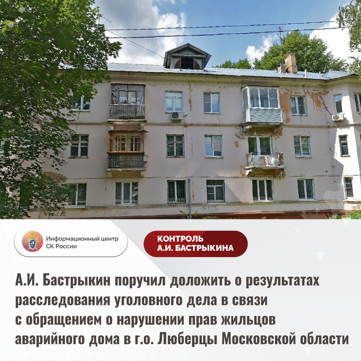 А.И. Бастрыкин поручил доложить о результатах расследования уголовного дела в связи с обращением о нарушении прав жильцов аварийного дома в г.о. Люберцы Московской области