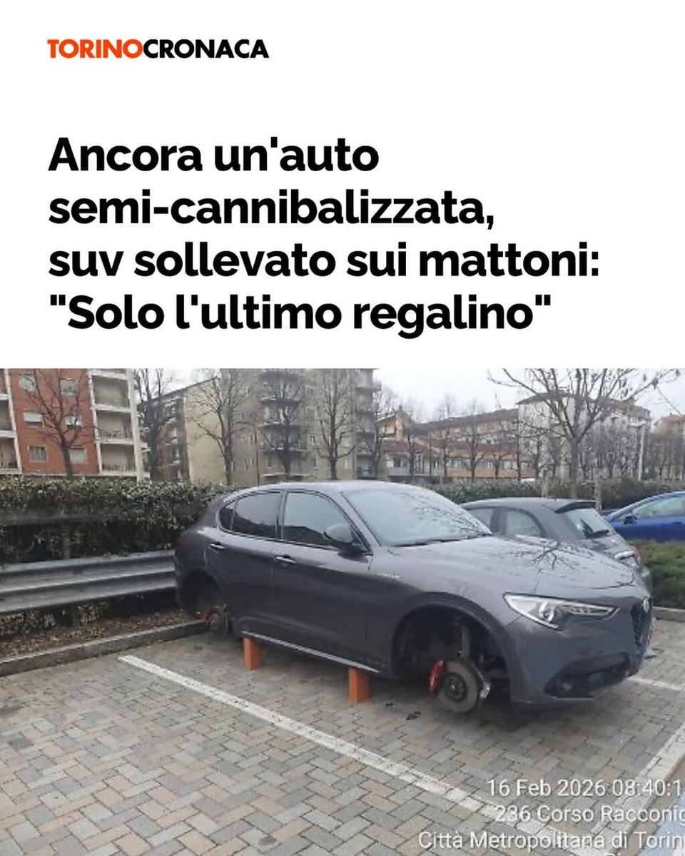 ✅ СПРАВКА: Эта новость переведена и размещена при помощи искусственного интеллекта Chat GPT без участия человека, в случае если вы заметили ошибку, или новость не соответствует реальному событию — сигнализируйте, исправим. 👉 Искренне Ваш Сержио Боттичелли: https://www.facebook.com/mercator.cz __________________ Еще один автомобиль был ограблен в районе Сан-Паоло. Утром сегодня, в понедельник, 16 февраля 2026 года, владелец SUV Alfa Romeo Stelvio обнаружил свой автомобиль приподнятым и установленным на несколько кирпичей, без всех четырех колес: полуразобранным. Автомобиль был припаркован перед домом номер 236 по corso Racconigi, недалеко от перекрестка с largo Orbassano. Согласно первому расследованию, кража произошла ночью: грабители действовали всего за несколько часов, сняв колеса и оставив автомобиль полностью неподвижным. После обнаружения владелец обратился в правоохранительные органы, чтобы подать заявление. В настоящее время проводятся проверки, чтобы попытаться установить