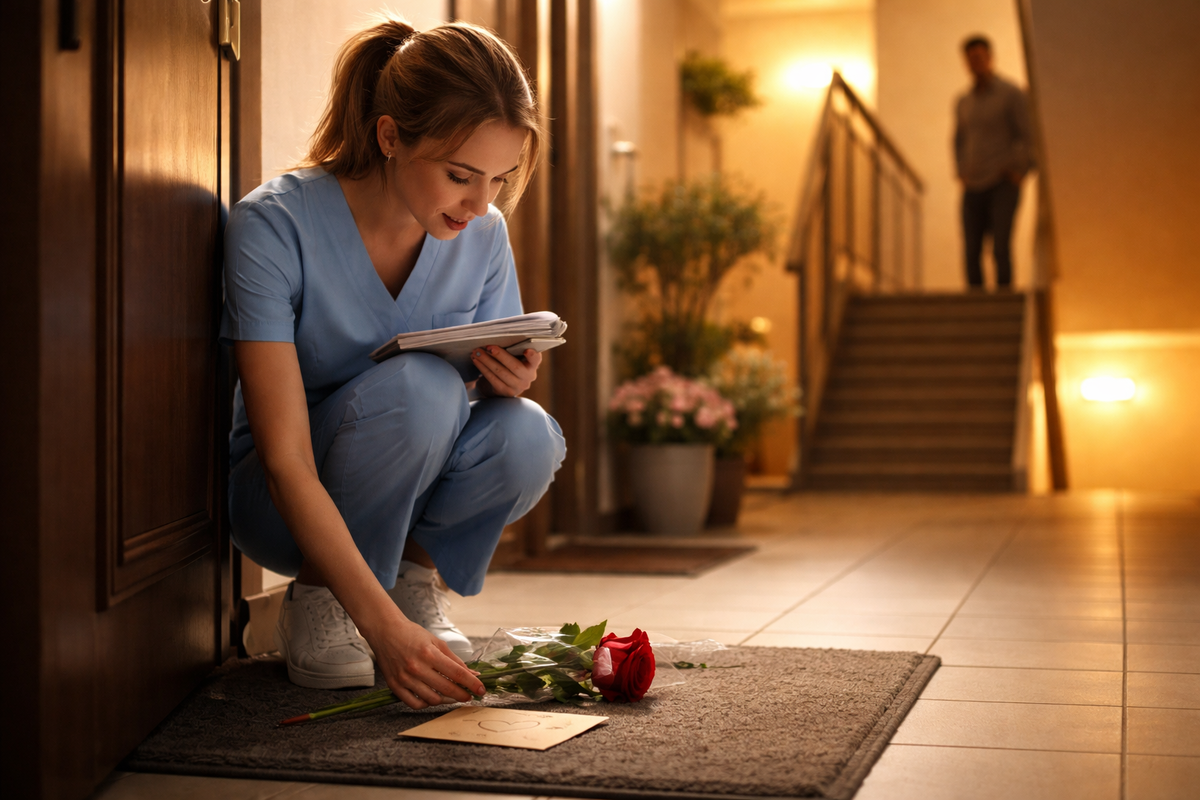 Однажды, возвращаясь после ночного дежурства, она вышла из лифта и заметила на коврике перед своей квартирой узкий свёрток. Она наклонилась, развернула упаковку — и замерла. Внутри лежала свежая алая роза в прозрачной красивой обёртке. Оля мгновенно оглянулась в лестничный пролёт: не мелькнёт ли кто-то на ступенях, не хлопнет ли дверь этажом ниже. Но подъезд был пуст и тих, как будто весь дом затаил дыхание.