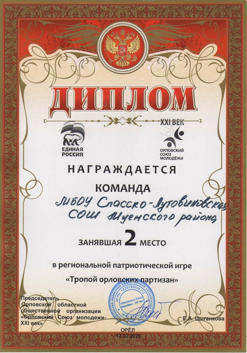 Ученики Спасско-Лутовиновской школы Мценского района приняли участие в региональной патриотической игре «Тропой орловских партизан», посвященной памяти героев партизанского движения. Мероприятие организовали в Военно-историческом музее города Орла. Мценский район представили ученики Валерия Гурина, Владислава Тимошина, Мария Паршакова, Виктория Локсаева, Дарья Киреева, Дмитрий Санюкович, Евгений Гурин, Арсений Пинаев и Азамджон Хакимов. Организаторы мероприятия превратили музей в импровизированный лес, в котором были расположены секретные локации. Дети успешно прошли все конкурсные испытания: шифровальная комната, полевая кухня, агитационные плакаты, лекарственные травы, оказание первой помощи, воинские звания, топография, военный аэродром, партизанское оружие, песни военных лет, улицы героев. Участники также показали навыки ориентирования на местности и ответили на вопросы викторины о партизанском движении на Орловщине. По словам преподавателей, ребята проявили блестящую интуицию и в