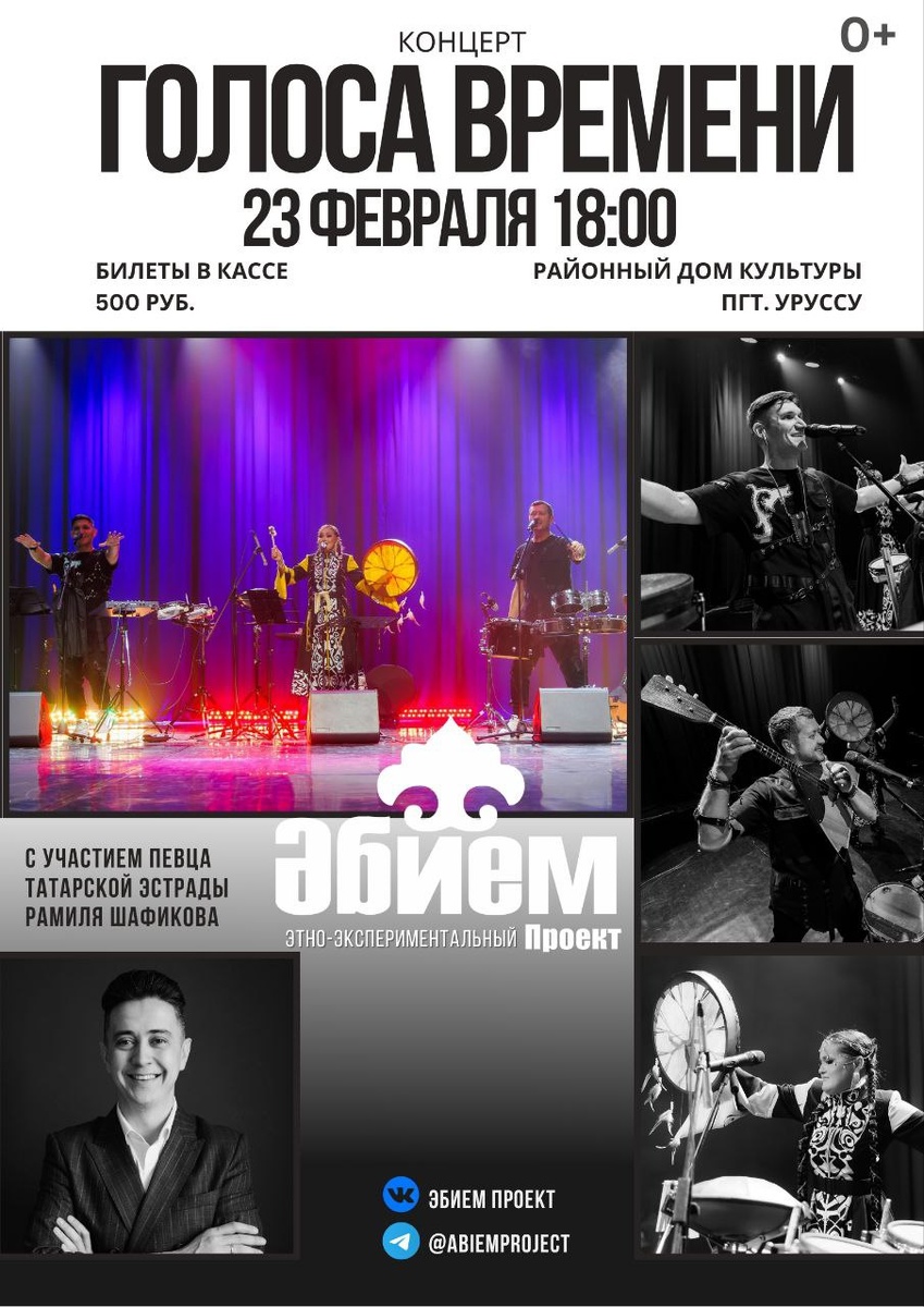 ! 23 февраля 18:00 Районный дом культуры п.г.т. Уруссу Билеты в кассе (500 руб.) Готовы спеть "Калинка малинка" и "Челтер- челтер" ? Концерт "Голоса времени" это воплощение национальной музыки в новом звучании. Концерт пройдет в живом звучании музыкальных инструментов: дарбука, джембе, барабаны,курай, свирель, кубыз (варган), гитара, клавишные инструменты и многие другие. Программу также украсит певец татарской эстрады Рамиль Шафиков с песнями "Яратам", "Йолдызлар" и другими известными композициями! В своих песнях АБИЕМ проект используют народные мелодии, которые были собраны в экспедициях по родному краю. Поэтому вероятность услышать в песне голоса вашего поселения очень велика!